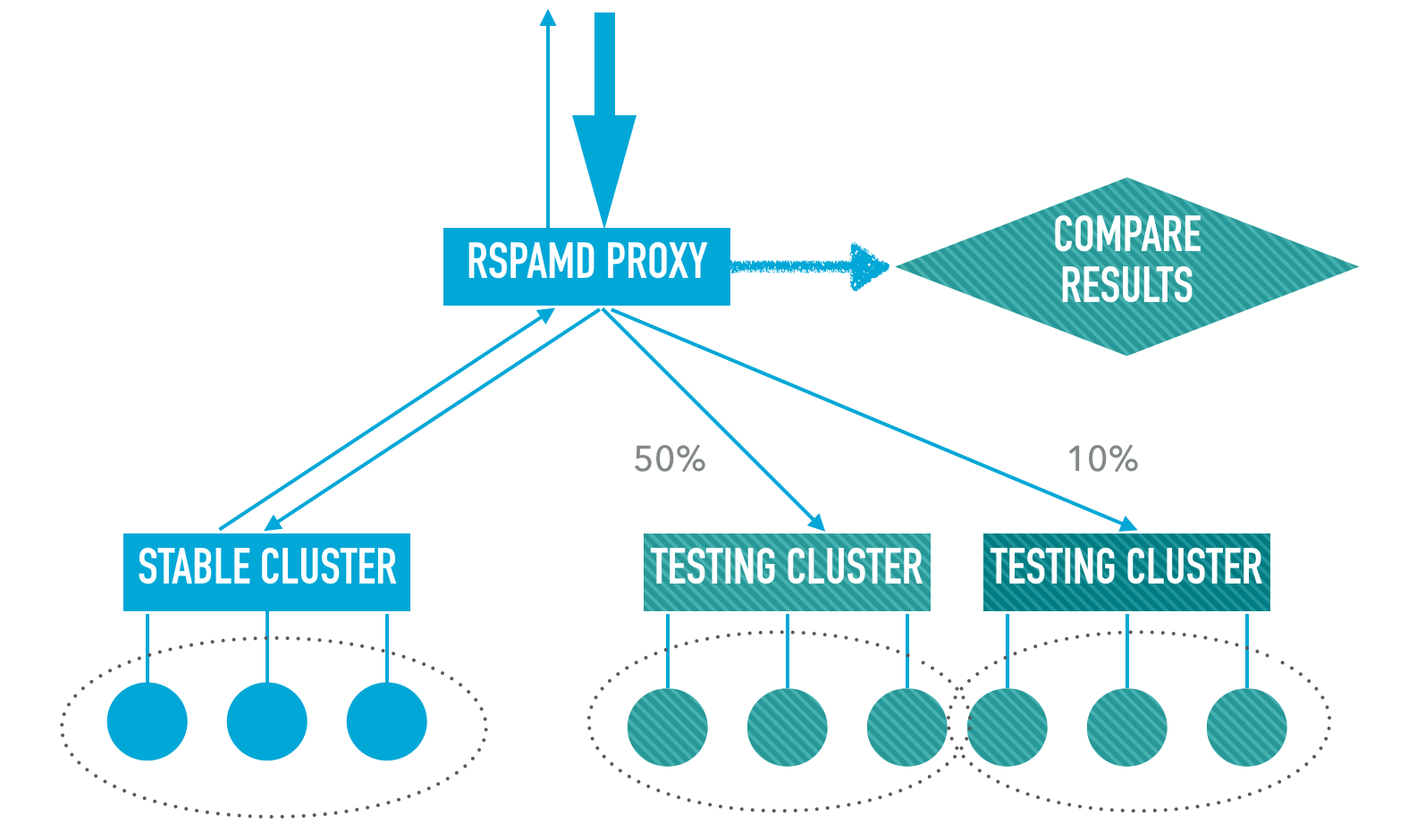 We understand the importance of testing when building spam filtering engines. Most testing work requires checking with production mail flows. The idea behind Rspamd proxy is to create a lightweight shim that can forward requests to the main Rspamd instance and mirror a certain percentage of mail to some testing environment and compare scan results afterwards. Moreover, Rspamd proxy can encrypt traffic and provide zero-copy forwarding for local connections. You can read more about Rspamd proxy in the media section where there is a link to a presentation that describes proxy features in detail.