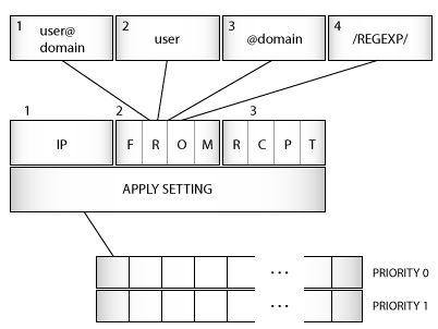 name - section name that identifies this specific setting (e.g. some_users)priority - high (3), medium (2), low (1) or any positive integer value (default priority is low). Rules with greater priorities are matched first. Starting from version 1.4, Rspamd checks rules with equal priorities in alphabetical order. Once a rule matches, only that rule is applied, and the rest are ignored.match list - list of rules which this rule matches: