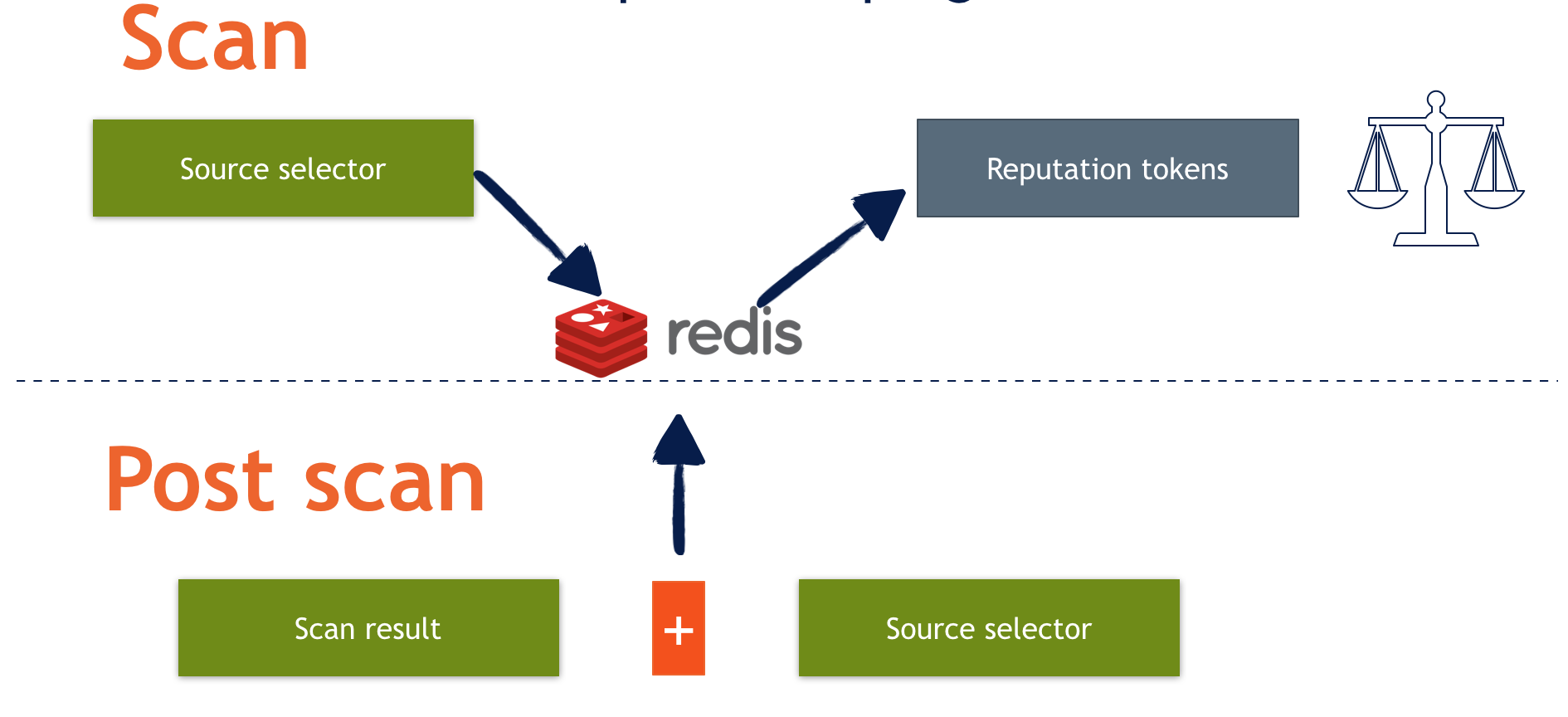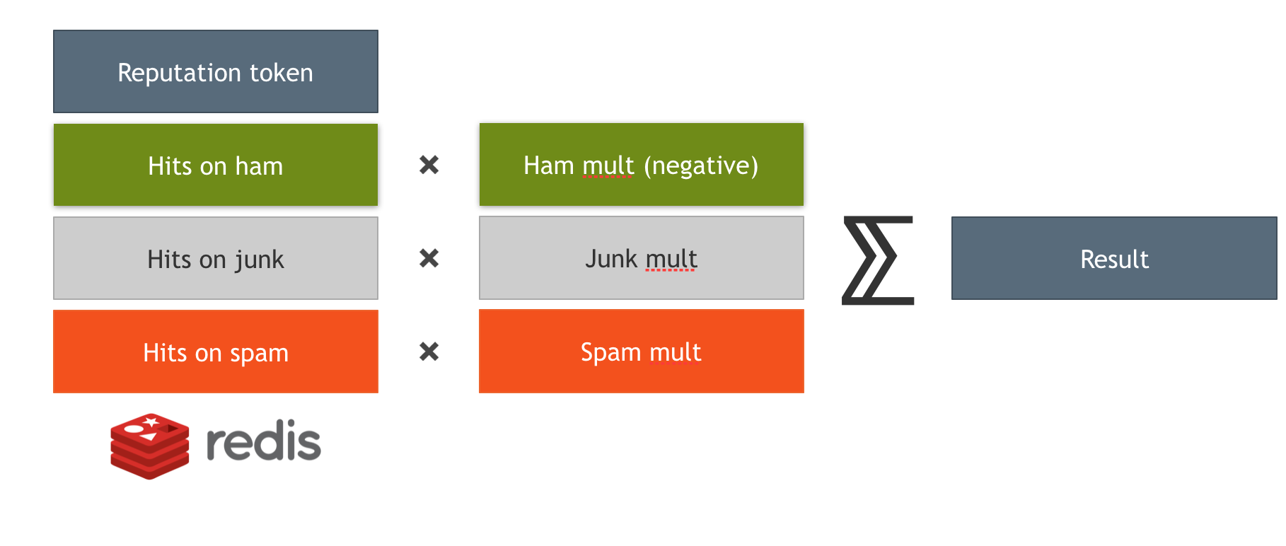 Selectors provide what are known as tokens for backends. For instance, in the case of IP reputation, these tokens could be asn, ipnet, and country. Each token is mapped to a particular key in the backend. In the case of Redis backend, there is a concept of buckets, with each bucket containing a set of counters that indicate the number of messages with a specific action: