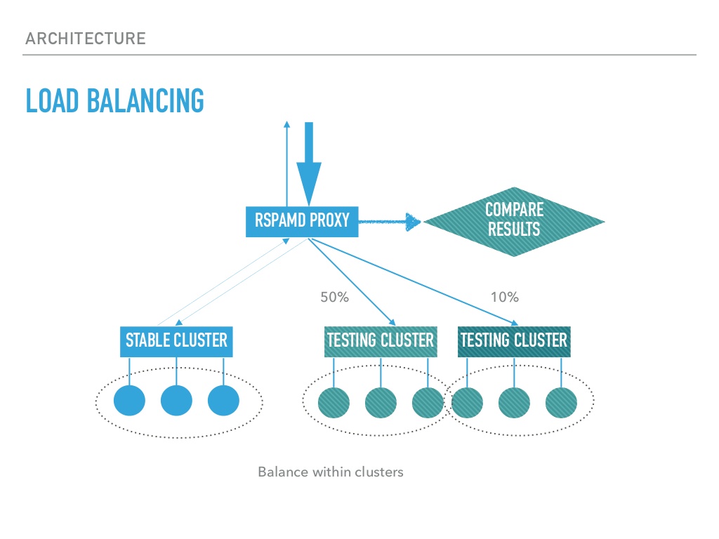 In this mode, Rspamd mirrors a portion of its traffic to a test cluster. The scan results from the test cluster are disregarded when responding to clients. However, optional comparison scripts can be initiated to assess the mirrored results. Below is a sample configuration for this setup, with no utilization of milter mode in this example: